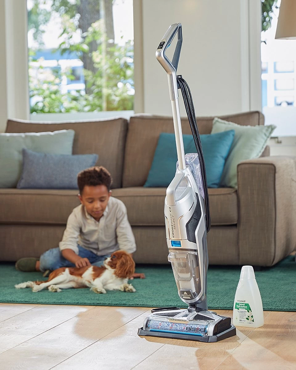 De BISSELL®CrossWave C3 Select zuigt, dweilt en droogt tegelijkertijd. Het zorgt voor een krachtige verwijdering van nat en droog vuil. Perfect voor het reinigen van verschillende soorten harde vloeren en vloerkleden. Maar ook voor kleine en grote hoeveelheden vuil op de vloer. Met de elektronische vingertopbediening kunt u direct schakelen tussen verschillende oppervlakken en zoveel water gebruiken als nodig is. Anders dan wanneer u een mop en emmer gebruikt, houdt onze dubbele reservoirtechnologie schoon en vuil water gescheiden. Met de CrossWave® C3 Select weet u dus zeker dat u uw vloer altijd met schoon water schoonmaakt.