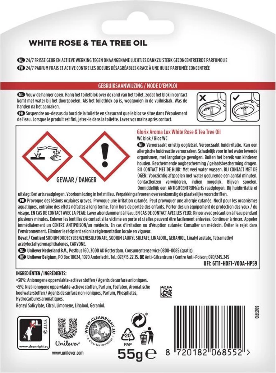 - Glorix Aroma Lux White Roses & Tea Tree Oil geeft 24/7 frisse geur dankzij sterk geconcentreerde parfumolie, die een krachtige geur afgeeft, zodat je toilet altijd fris ruikt.