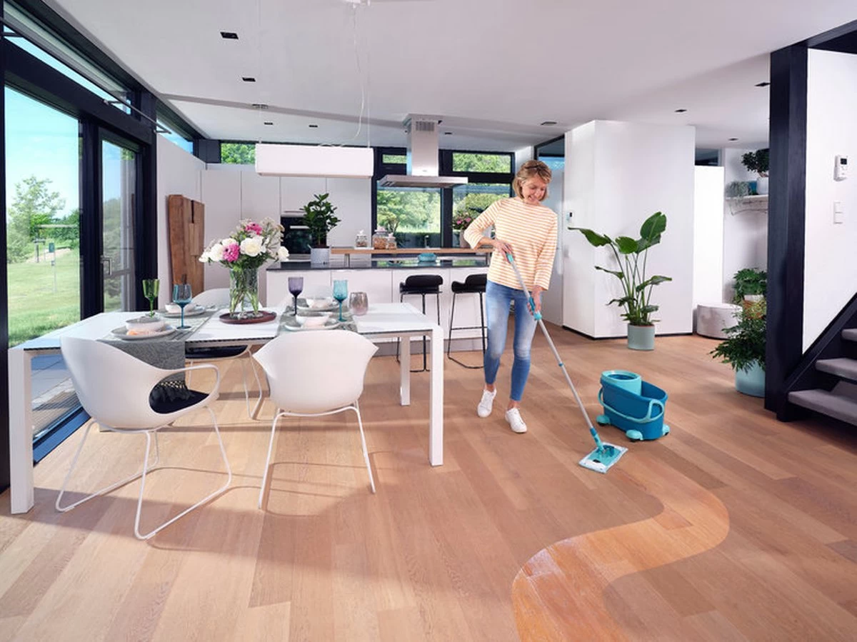 - De vochtigheid van de vloerdoek regel je zelf met de handige centrifugeer-stop-functie. Dat is ideaal voor nevelvochtig vloerwissen met zachtheid.
