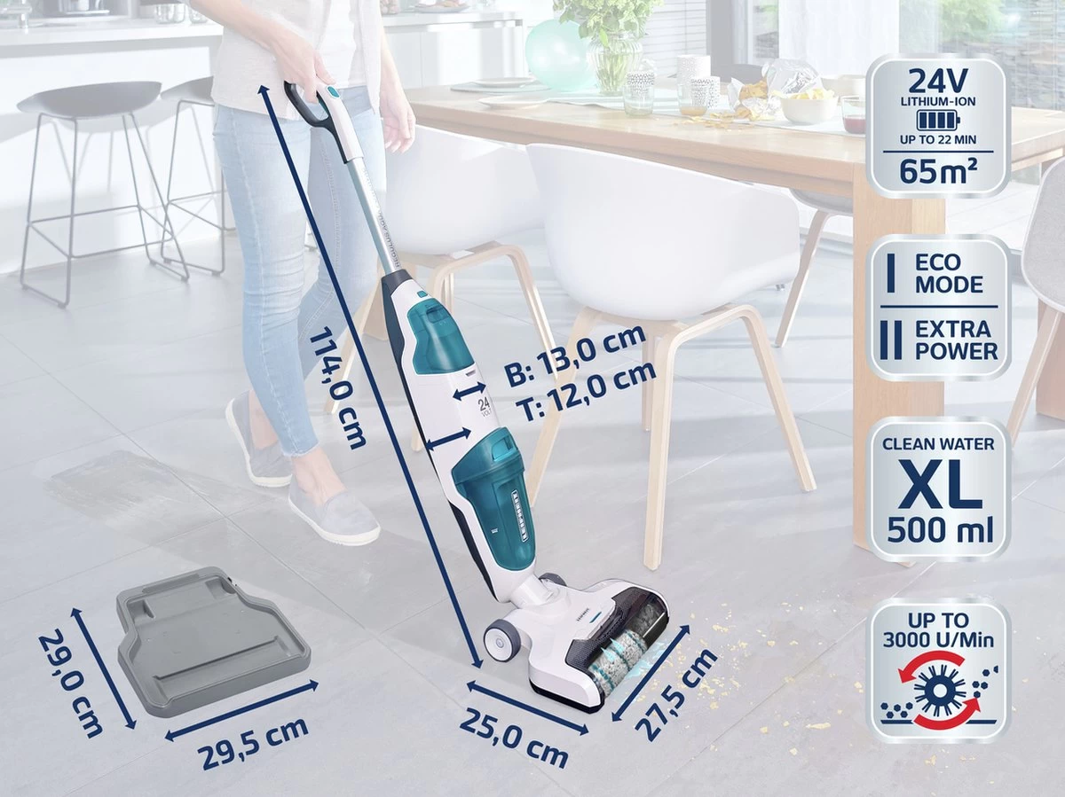 Het apparaat heeft een 24 V lithium-ion-accu. Daardoor werkt het zonder snoer en is het altijd meteen startklaar. Gemakkelijk te hanteren dankzij het wendbare design en het lage gewicht van slechts 3,3 kg – ook in een kleine ruimte. Het apparaat heeft twee schoonmaakstanden: een ecomodus en voor maximale schoonmaakpower een turbomodus.