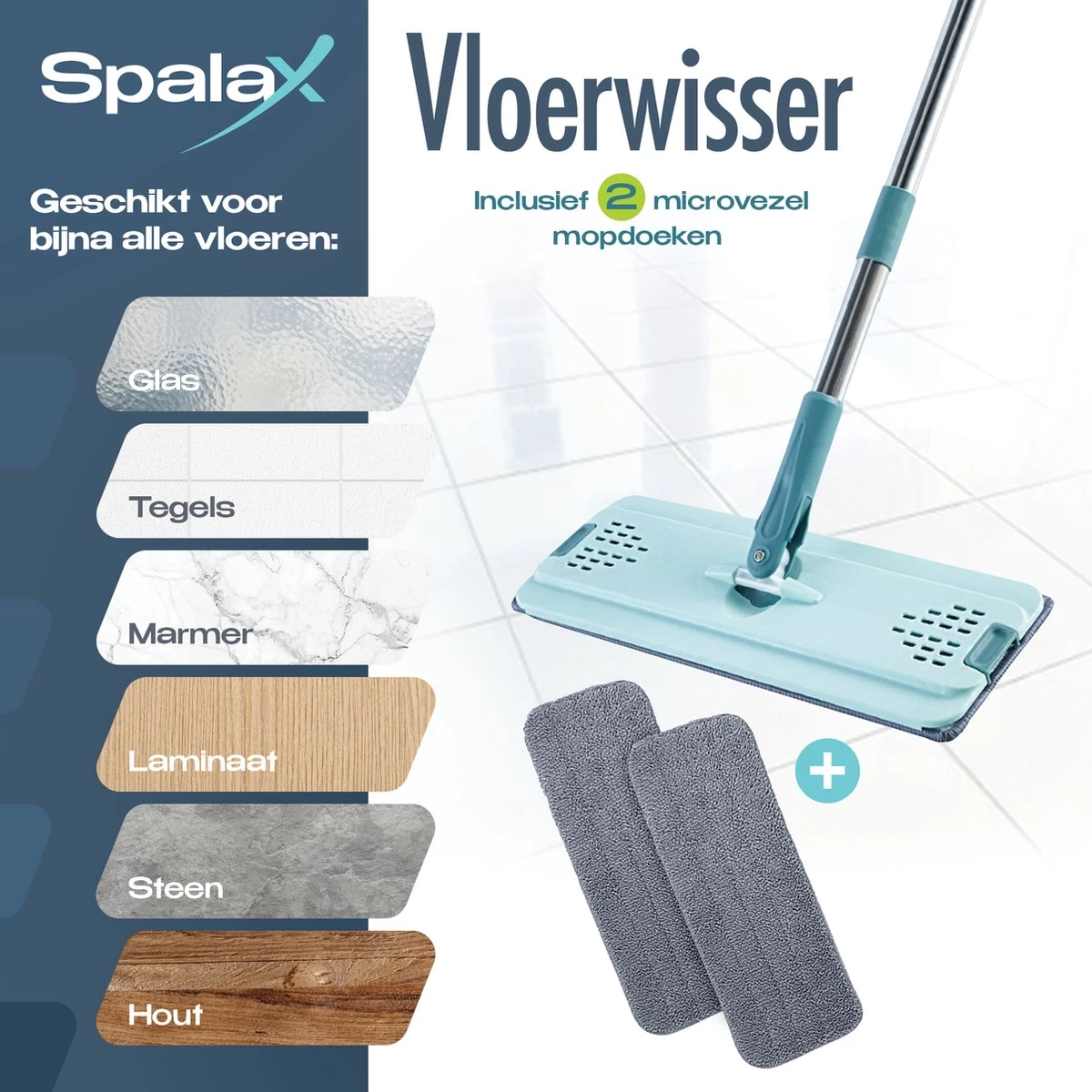 De ultraslank en duurzaam gebouwde vloermop wordt geleverd met 2 herbruikbare microvezel moppen. De mop kan droog en nat worden gebruikt voor het snel en efficiënt verwijderen van water, stof, olie, haar en vuil zonder sporen achter te laten. De microvezeldoeken zijn zowel met de hand als de machine te wassen. De doeken kunnen een lange tijd gebruikt worden zonder te beschadigen of vervormd te raken.