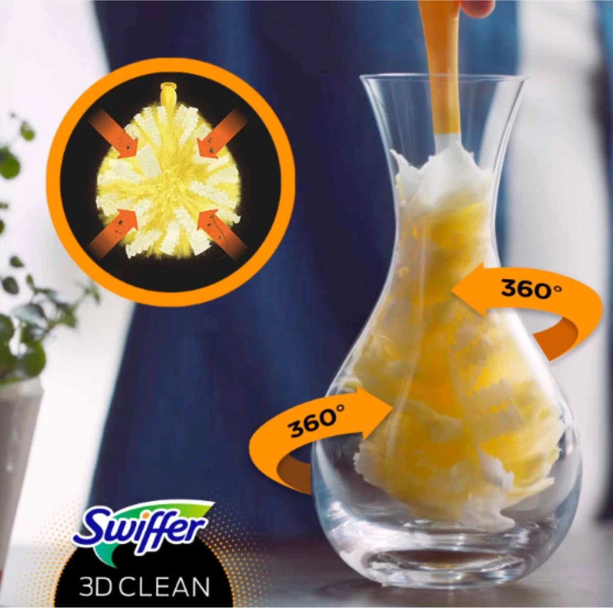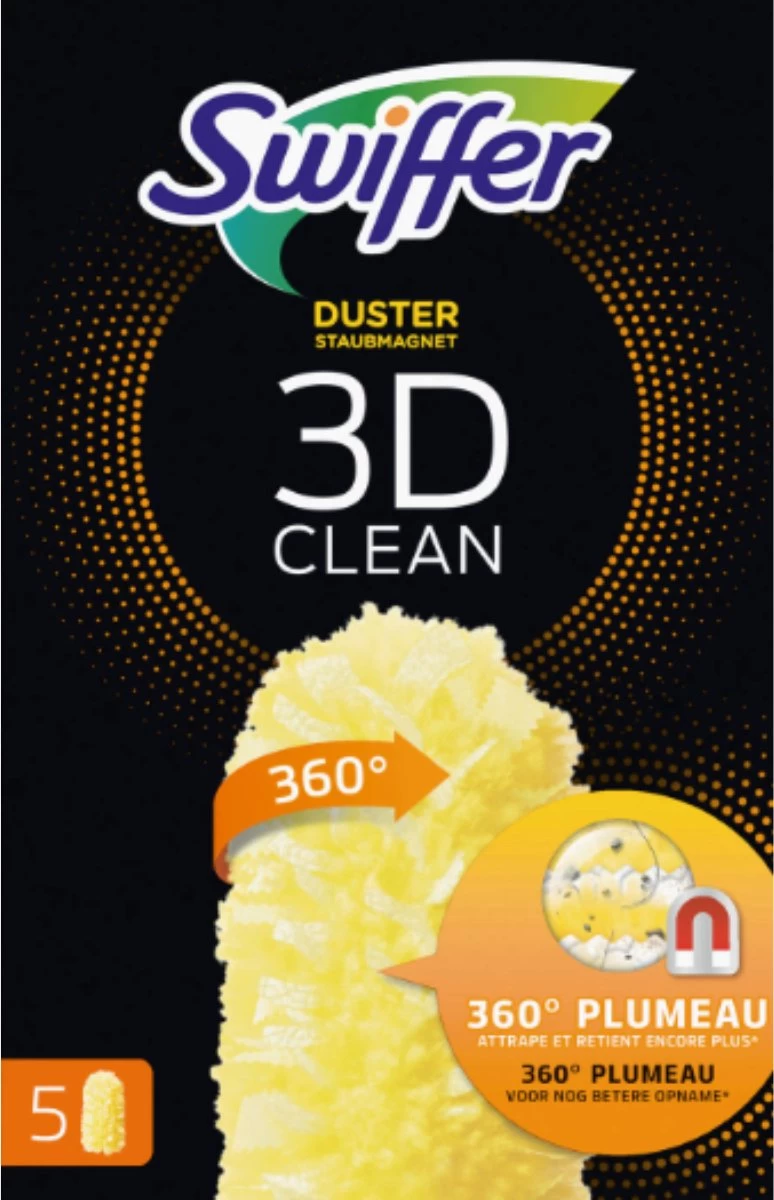 Swiffer 3D Clean is de nieuwe, premium lijn van Swiffer. Deze Swiffer 3D collectie biedt een 360 graden stofdoek waardoor het afstoffen nog gemakkelijker en sneller gaat. Deze 360° Swiffer stofdoek vangt en houdt tevens nog meer stof en haren vast ten opzichte van de klassieke Swiffer duster afstofdoekjes. Daarnaast zijn deze doekjes geproduceerd met 33% gerecyclede synthetische vezels.