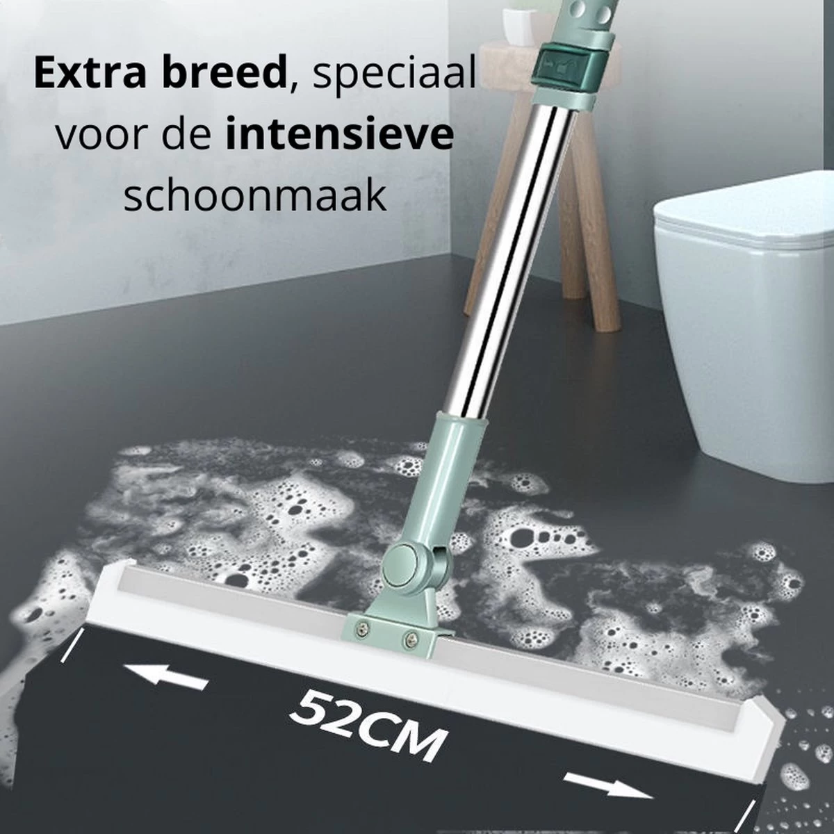 Zafio vloertrekker met steel die uw badkamer, douche en ramen goed en netjes droogmaakt. De vloerwisser is verstelbaar van 80 t/m 130 cm en is 52cm breed, speciaal om alles goed droog te maken. De watertrekker van Zafio is 180 graden draaibaar en kunt u zowel gebruiken voor de vloer als voor uw ramen, multifunctioneel dus.